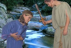 She falls to the floor in pain and screeches "My father, the king, will avenge me!"