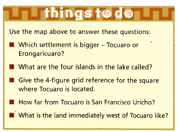 | ACTIVITIES 1) Watch the video 'Where is Tocuaro?' to find out exactly where the village is. 2) Watch the video 'What is Tocuaro like' until 2:04 minutes (don't watch the school section yet) - use this video and the map of the village below to decide how the village is different from Huntington and how it is the same (draw up a table with 2 columns - Similarities & Differences). 3) Complete the mapwork activities at the bottom of this page. 4) Watch the videos of Mexico City to see how very different the villages and cities of Mexico are - click HERE to go the videos page. You can use Google Streetview to see both Tocuaro and Mexico City - just search for them in Google, select Maps, and drag the little yellow figure onto the map. |