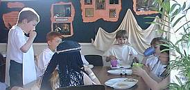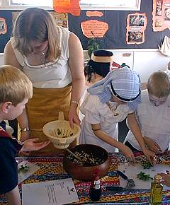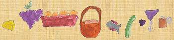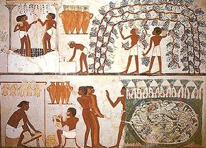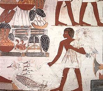 Types of food The ordinary Egyptians ate some fruit - grapes, dates, figs and pomegranates. Egyptian men hunted animals, while the women cooked the food and made bread. If you were a meat eater in Egyptian days you would have to eat beef. They even offered bull’s legs to the gods at the temple. Bread was soaked in water which had been sweetened with dates. At banquet, rich Egyptians might have roast chicken, cheese and honey cake. |